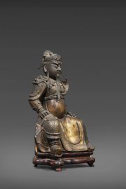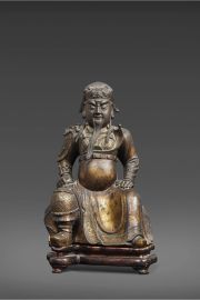 in bronzo dorato di Guandi. La figura è rappresentata seduta con le mani appoggiate sulle gambe, vestita con armatura e abiti con cintura, sfoggia una lunga barba che scende dal viso pensieroso; alt. cm 33,5