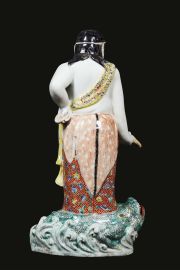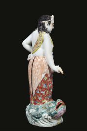 in porcellana policroma raffigurante personaggio su animale marino; alt. cm 40