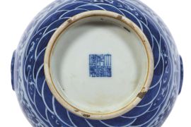 in porcellana bianco blu con decoro ming style, di forma Hu, marcato Qianlong in blu sotto smalto; alt. cm 26,2