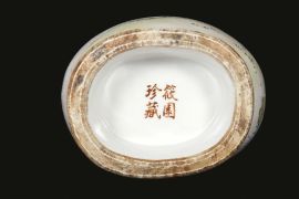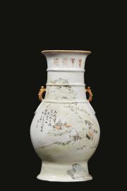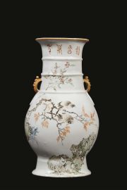 in porcellana policroma, dalla forma “HU” con piede rialzato, pancia allargata, collo stringente e bordo svasato, da un lato dipinto a paesaggio montano con scritte, dall’altro due uccelli sopra una roccia fra rami e foglie. Sopra i manici sono presenti dei caratteri arcaici in rosso sotto smalto, marchio a quattro caratteri sotto la base; alt. cm 39,8