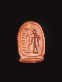 L’amuleto è un’interessante variante del comune scarabeo inciso, in cui compare al posto dello scarabeo la figura dell’animale sacro a Thoth, dio della luna e della sapienza.