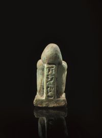 Amuleto in faience verde-azzurra a forma di statua cubo: l’uomo seduto con le braccia incrociate, tiene nella mano destra un pilastro djed e nella sinistra una lattuga, simbolo di fertilità. Sulla testa porta una parrucca con i bordi torniti. Un testo disposto su tre linee orizzontali è inciso sul fronte della statua mentre sul pilastro sul retro è indicato il nome dell’onorato Djesertayned. H. 5,5 cm; base 3,5 x 2,5 cm.