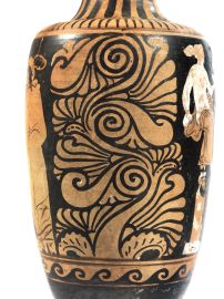 Questo vaso, non comune e monumentale versione della forma vascolare della situla, può essere attribuita con precisione al Pittore C.A. uno delle figure più rilevanti nella ceramografia campana della seconda metà del IV secolo a.C. Alla stessa mano appartiene una situla monumentale già nella collezione Gorga ora a Cleveland (OH), Museum of Art (inv. 67.245: C.G. Boulter, CVA Cleveland 1, Princeton 1971, p. 29, tav. 45.5-6). Il lato B corrisponde alla perfezione con una sola sottile variazione in un riempitivo in alto a sinistra; il lato A è analogo nelle figure sul registro superiore mentre diverge nella presenza del guerriero di fronte all’erma, peculiare dell’esemplare qui proposto.