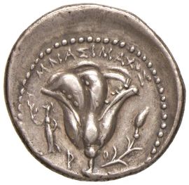 Didramma in argento. D: testa di Helios con corona radiata, in visione frontale. R: rosa fiorita con bocciolo a destra entro bordo perlinato. Nel campo, a sinistra Atena stante sorregge una figura di Nike con la destra portata in avanti. Sopra, il nome del magistrato responsabile per l'emissione MNAΣIMAKOΣ. Alla base dello stelo l’indicazione del nome dell’isola P - O. Peso 6,87 gr. Diam. 21 mm.