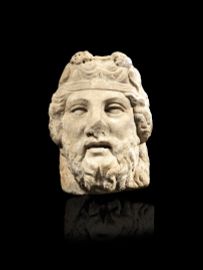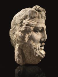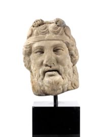La testa, i cui chiaroscuri accentuati a trapano fanno propendere per una datazione fra il I secolo d.C. avanzato ed il successivo, mostra il dio barbato riccamente adornato come per il simposio. L’appiattimento delle superfici non lavorate sul retro probabilmente consente di ascrivere la testa ad un’erma (o eventualmente a una doppia erma). Corrispondenze iconografiche per il soggetto si possono trovare sia in erme di dimensioni inferiori a quella qui proposta (Laon, Musée d'art et d'archéologie, inv. 37.1247) sia in grandi erme, come quella al Museo Chiaramonti al Vaticano (inv. 1389, B. Andreae, a cura di, Museo Chiaramonti 1, Roma 1995, tav. 247) e sculture a tutto tondo come il Dioniso dalla collezione Farnese (Napoli, MAN inv. 6350: C. Gasparri, a cura di, Le sculture Farnese I. Le sculture ideali, Milano 2009, p. 130, n. 57).