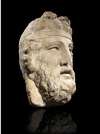 Testa in marmo bianco a grana fine, raffigurante il volto di Dioniso. Il dio, rappresentato come un uomo maturo con barba fluente e bipartita, presenta arcate sopraccigliari marcate, occhi ovali chiaroscurati, naso diritto e labbra schiuse, che lasciano vedere i denti. Sulla capigliatura, fluente e resa con ciocche voluminose e poco definite che coprono le orecchie, è posta una tenia che attraversa la fronte ed è fissata sulla sommità del capo da foglie e frutti d’edera. H. 25 cm.