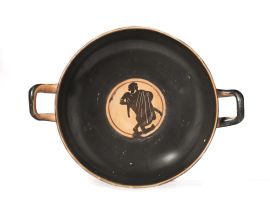 Coppa con orlo assottigliato, ampia vasca troncoconica, piede a disco connesso alla vasca da uno stelo. Due anse orizzontali sono impostate a metà della vasca. La decorazione figurata consiste in due scene uguali su entrambi i lati del vaso: Eracle che combatte contro il toro di Creta, fra un astante a destra ed il cavallo alato, Pegaso, a sinistra. L'eroe nudo e sbarbato è riconoscibile per la clava che è posta in alto fra lui e Pegaso, mentre un altro attributo di Eracle, la faretra, è sospesa sopra il toro. Sotto le anse sono poste foglie di edera. Al centro della vasca nel tondo è presente una figura maschile ammantata. Una fascia a risparmio sotto la scena figurata, una sull'orlo e una nel tratto superiore delle anse. H. 7,4 cm; diam. orlo 18 cm.