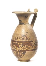 Grande olpe con corpo ovoidale espanso nel suo tratto inferiore, orlo svasato, collo a profilo concavo distinto da un collarino, basso piede ad anello. Ansa verticale a triplice bastoncello con due rotelle sull’orlo. La decorazione figurata si pone su quattro fasce e consiste in teorie di animali e Mischwesen, intervallate da gruppi di tre linee in paonazzo entro ampia banda di colore bruno. Fra gli animali, oltre ai più comuni cervi od erbivori pascenti, possia-mo riconoscere un lupo. Riempitivi a rosetta semplice fra le figure. Numerosi dettagli delle figure, già resi ad incisione, sono arricchiti dall’uso del colore paonazzo. Nel tratto inferiore del corpo sopra il piede è una corona di raggi. H. 43 cm, diam. orlo 18 cm.