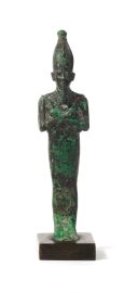 Bronzetto raffigurante Osiride, dio egizio della resurrezione. La divinità, stante e in forma di mummia, porta sul capo la corona bianca (hedjet) dell’Alto Egitto e sul mento una barba posticcia, tiene nella sinistra un lungo scettro ricurvo e nella destra un flagello. H. 18 cm.