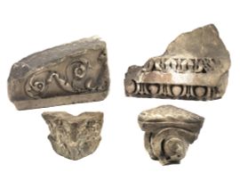 Lotto composto da sette manufatti in marmo. Quattro sono di tipo architettonico: una voluta di un capitello ionico, un semicapitello miniaturistico corinzio con foglie d’acanto, un elemento di soffitto (o di cornice) con corona di ovuli e kyma lesbio, un elemento triangolare con girali vegetali carnosi (forse parte di un piccolo frontone). Tre sono sculture: una testina femminile dal volto ovale, un frammento di sarcofago con un erote e un tratto di bordo di vasca con una testa leonina con gocciolatoio. H. da 5 a 22 cm
