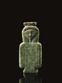 Amuleto in pietra verde, composto nel tratto inferiore da un nodo isiaco (Tyet), sopra al quale è posta, in modo inconsueto, una testa di Hathor con parrucca tripartita e volto dalle orecchie bovine. H. 5,7 cm.