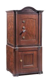 corpo superiore contenente cassaforte in acciaio dipinto a finto legno, corpo inferiore in legno dipinto con sportello, fronte inquadrato da semicolonne, coronamento centinato nel quale è applicata in bronzo dorato la marca F. WERTHEIM & COMP. WIEN, completa di chiavi, cm 135x63x58