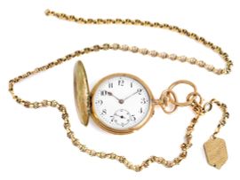 cassa in oro 12kt in quattro parti, quadrante bianco con numeri arabi e contatore dei secondi a ore 6, fondello interno firmato "Ancre", vetro plastica, movimento a carica manuale, corredato di catena in oro a basso titolo con piccolo portafoto, gr 33, complessivi gr 83. Diam. mm 45