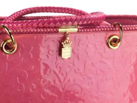in vernice fucsia serigrafata Le Volutes, doppio manico portabile anche a spalla con stemma logo e dettagli in metallo dorato. Due tasche interne. Corredata di sacchetto originale.