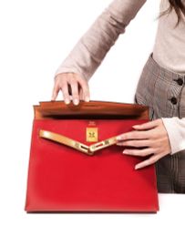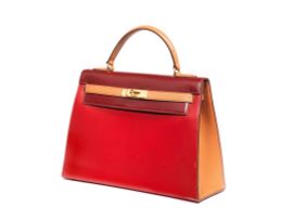 risalente ai primi anni ’90, in Box Calf tricolore, bordeaux, rosso e gold, con metalleria in ottone. Corredata di lucchetto.