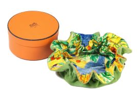 in morbido camoscio verde con interno in seta stampa foulard, base rotonda con chiusura a coulisse con cordino verde e metalleria dorata, interno con otto tasche aperte. Corredato di scatola originale.
