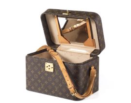 in tela Monogram su base rigida con chiusura in metallo dorato e tracolla regolabile. Interno in pelle con tre spazi per bottigliette cosmetici e specchio estraibile dim. cm 19x14. Dim. porta cosmetici cm 32x21x20