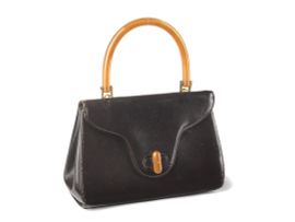 in pelle spazzolata testa di moro, con chiusura e manico effetto bachelite. Corredata di sacchetto in panno rosso.