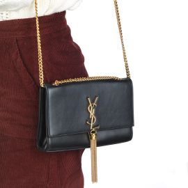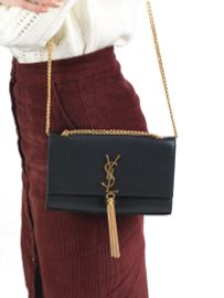 in vitello nero, con catena in ottone, chiusura a calamita con logo e nappa in ottone.