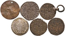 ORIENTE LATINO. SEI CONTRAFFAZIONI DI ZECCHINI E GROSSI VENEZIANI IN RAME (5) E ARGENTO (1)
