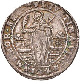 Ar gr. 28,00 D/ S. Marco porge il vessillo al Doge genuflesso ; es. DG R/ Santa di fronte in piedi con palma e libro trafitta da pugnale ; dietro mare e galee Mont. 1867 Paol. 13