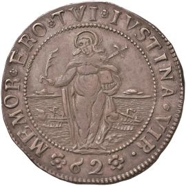Ar gr. 7,05 D/ S. Marco porge il vessillo al Doge genuflesso R/ Santa di fronte in piedi con palma e libro trafitta da pugnale; sullo sfondo mare e galee Mont. 3084 Paol. 23