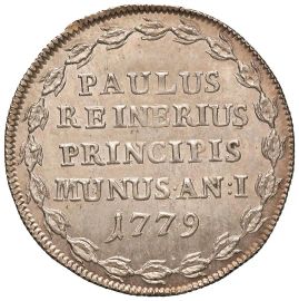 Ar gr. 9,92 D/ L’Abbondanza con cornucopia; ai piedi Leone. Es. B C (Benetto Cappello) R/ PAVLVS REINERIVS PRINCIPIS MVNVS AN I 1779 tra ghirlande Mont. 3245 Paol. 262