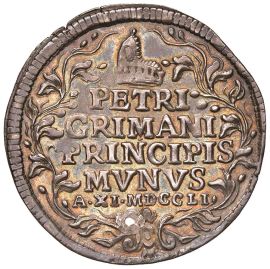 Ar gr. 9,78 D/ S. Marco e il Doge in preghiera sotto un tabernacolo con l’Annunciazione; es. AB (Alvise Barbaro) R/ Corno dogale con scritta su 5 righe Mont. 2703 Paol. 233