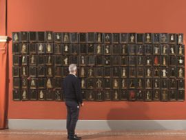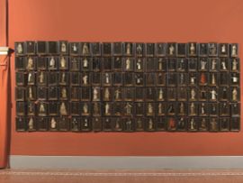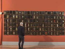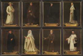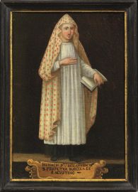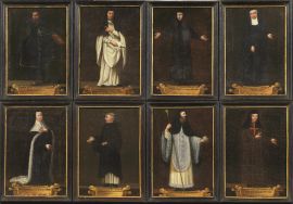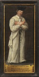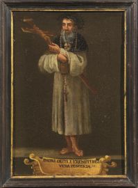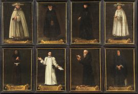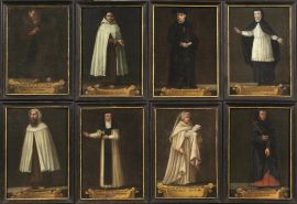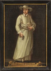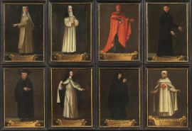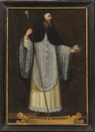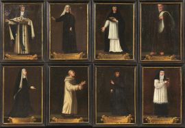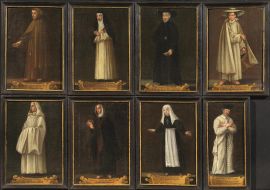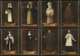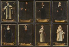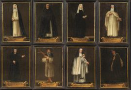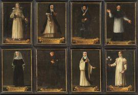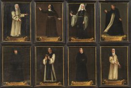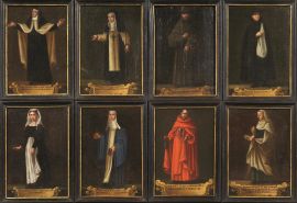 Sorta di dizionario figurato degli abiti degli ordini religiosi esistenti nel XVII secolo, il lotto offerto, davvero una rarità sia dal punto tipologico che iconografico, è costituito di 126 piccole e raffinate tele, ognuna delle quali raffiguranti in maniera minuziosa la veste che contraddistingue ogni figura di prelato, monaco, suora o padre eremita. In aggiunta, i fiori, i libri, il crocifisso e gli altri simboli che li caratterizzano forniscono ulteriori dettagli utili per l’identificazione del religioso e della sua vita spirituale. Il cartiglio posto in calce indica infine il nome dell’ordine di appartenenza svelando congregazioni davvero poco note come le monache dell’ordine di Santa Perpetua, ornate di un velo bianco coperto di piccole croci rosse o i padri detti “Eremiti della vera Penitenza” con una specie di spilla a forma di teschio che ferma il loro abito sul petto.