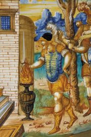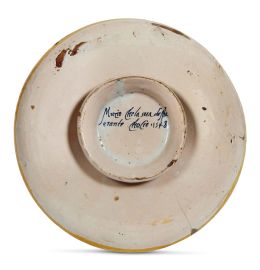 in maiolica, forma concava poggiante su alto piede. L’ornato a policromia occupa l’intera superficie e raffigura la scena di storia romana relativa al sacrificio di Muzio Scevola. Al retro sotto il piede si legge la scritta in corsivo in blu di cobalto: Muzio che la sua destra / erante chocie. 1548. L’episodio storico racconta appunto il gesto di Muzio Scevola, soldato che durante l’assedio di Roma ad opera degli etruschi guidati da Porsenna si reca presso l’accampamento nemico per uccidere il comandante avversario; giunto armato di pugnale presso l’accampamento trova il re intento a distribuire la paga ai soldati, ma uccide per errore lo scriba addetto al pagamento; catturato, decise di punire la propria mano destra, che aveva mancato il suo compito, bruciandola sul braciere; colpito dal gesto del giovane e dalla minaccia che come lui altri romani fossero disposti al sacrificio, il re Porsenna intavolò le trattative di pace. L’iscrizione, che per stile e data è attribuibile alla mano di Sforza di Marcantonio, e lo stile pittorico ci portano a confronti precisi come, ad esempio, il modo di raffigurare il re Porsenna seduto in trono, presente in altre opere del pittore durantino, o la figura stessa di Muzio Scevola, che trova puntuale raffronto nel piatto con scena romana del British Museum (inv 1985.1002.1), dove la figura del re Astiage è molto simile per posizione e caratteristiche stilistiche con il protagonista della nostra coppa. Sappiamo che il pittore, nativo di Casteldurante, aveva lavorato a Urbino nei primi anni quaranta del Cinquecento per spostarsi poi a Pesaro, almeno dal 1548 e qui lavorare forse presso la bottega dei Lanfranco, dove potrebbe aver realizzato il nostro piatto; diam. cm 27,8, diam. piede cm 12,6, alt. cm 6,2