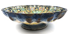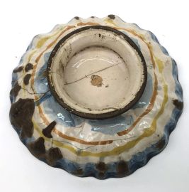 in maiolica dipinta in blu di cobalto, verde, giallo antimonio, giallo ocra e bruno di manganese; formata a stampo, presenta un umbone centrale rilevato e orlo mosso. Il decoro è realizzato con colori vivaci e mostra al centro un motivo a scacchiera e intorno un decoro a quartieri con riserve a ornati fogliati disposti simmetricamente e alternati a motivi ispirati alle coppe a quartieri faentine. Lo smalto è povero e poco consistente; diam. cm 23,8, diam. piede cm 11,2, alt. cm 7,2