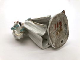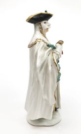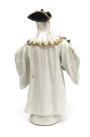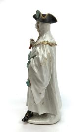 in porcellana dipinta in policromia, raffigurante una maschera della commedia dell’arte generalmente identificata con l’Avvocato modellato da J.J. Kändler. La maschera indossa un tricorno nero con finiture dorate, una maschera bianca, un domino bianco con bordi dorati e rosette turchesi e maniche lunghe, guanti bianchi, calzoni bianchi scarpe nere con larga fibbia; cm 16,1x9,6x6,5
