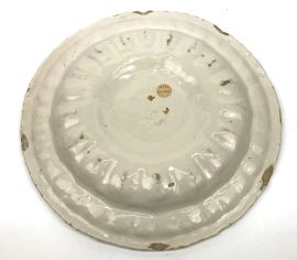 in maiolica bianca; il cavetto piano è appena rialzato e circondato da una fascia a rilievo, la balza e la tesa sono decorate da baccellature concave di diverse dimensioni. La superficie è lasciata bianca priva di decorazione, secondo l’uso del periodo compendiario, a lasciare in evidenza la forma mutuata dai bacili metallici; diam. cm 48