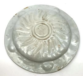 in maiolica bianca con decoro policromo al centro; modellato a sbalzo, presenta un umbone centrale a ghirlanda attorno alla quale si dispongono delle nervature sinuose con andamento a raggera; la tesa accoglie impronte di conchiglie alternate a foglie. Al centro dell’umbone è dipinto uno stemma gentilizio a quartieri incorniciato in un cartiglio azzurro; diam. cm 50,8