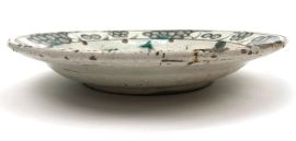in ceramica invetriata policroma. Grande bacile a orlo liscio, tesa obliqua, cavetto concavo ribassato al centro. Il decoro dipinto sottosmalto dipinto di blu, rosso corallo, verde, nero, raffigura una nave a vela in un mare calmo e occupa l’intero cavetto e la balza, mentre la tesa è decorata con onde e rocce. I colori non sono lucenti e prevale l’uso del manganese, del nero e del verde in una tonalità scura, che fanno pensare a un periodo produttivo già prossimo al secolo XVII. Questo piatto appartiene a un piccolo gruppo di opere raffiguranti velieri, generalmente galee europee come in questo caso; nella marina ottomana, le navi con i remi e le vele furono utilizzate fino alla seconda metà del XVII secolo; diam. cm 28,7 diam. piede cm 15,2, alt. cm 5,2