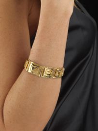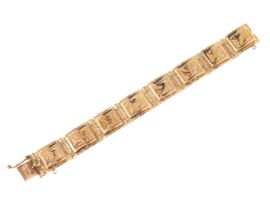 in oro giallo 18kt inciso, composto da una fila di maglie rettangolari a comporre un fregio con motivo decorativo zoomorfo, punzone 18kt, lungh. cm 19,5 , gr. 65