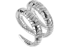 in oro bianco 18kt, impreziosito da diamanti taglio brillante per ct 9 circa, firmato “de Grisogono”, punzoni 750, del fabbricante e numero seriale B102444, diam. interno cm 5,5, gr. 140. Corredato di saccheto in pelle, scatola e cartellino.