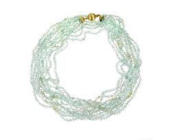 a cinque fili di acquamarine sfaccettate, fermatura in oro giallo e bianco 18kt con scanalature, punzoni 750 e del fabbricante, lungh. cm 108, gr. 197
