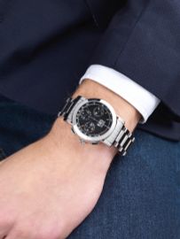 cassa a scatto in acciaio, quadrante nero, indici applicati, datario a doppia finestra, movimento cronografico a carica automatica cal. PP4500, bracciale in acciaio con chiusura a scomparsa, impermeabile 50MT, vetro minerale. Corredato di scatola e garanzia. Diam. 38