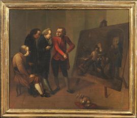 Come recita il cartellino posto al retro, il dipinto raffigura la commozione di Federico II di Hohenzollern, terzo re di Prussia dal 1740 al 1784, archetipo settecentesco del monarca illuminato, dinnanzi alla tela del pittore tedesco Daniel Chodowiecki (Danzica, 1726 - Berlino, 1801) illustrante l'ultimo saluto di Calas alla sua famiglia. Jean Calas, illustre mercante di Toulouse, nel 1762, era stato ingiustamente condannato a morte con l' accusa di aver ucciso il figlio maggiore, in realtà suicida, per impedire la sua conversione al cattolicesimo. Questo fatto fece scalpore, scatenando l'indignazione di molti, fra cui quella del filosofo francese Voltaire che rivendicò la sua innocenza in nome della tolleranza religiosa.