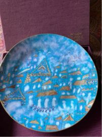 Borsa da signora di Roberta Balsamo, grande decorazione e fascia di gusto etnico di materiali policromi vari lungh. cm 40 h cm 15 e piatto in porcellana di Ginori dipinta in policromia con costruzioni, figure danzanti e un pesce, manifattura di Doccia, scritto sul retro Sohanan, 24 ottobre 1982, 341/350, Ø cm 32