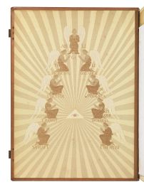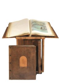 3 volumi in folio atlantico (820 x 650 mm). Vol. 1: [76] carte di testo (prima e ultima bianca) e [34] tavole a colori. Vol. 2: [73] carte di testo (prima e ultima bianca) e [33] tavole a colori. Vol. 3: [73] carte di testo (prima e ultima bianca) e [33] tavole a colori. Legatura editoriale in vitellino con al centro di ciascun piatto anteriore e posteriore un diverso bassorilievo in pelle più chiara, disegnato da Nattini, relativo alla cantica contenuta all’interno; ogni volume ha altresì sguardie in seta decorata con motivi attinenti alla cantica; fermagli. Cerniere molto fragili e tendenti a spaccarsi a causa del peso, alcuni fermagli assenti, qualche abrasione alle legature, qualche sgualcitura alle carte bianche iniziali, ma per il resto copia ottima e completa, con leggio per riporre verticalmente i volumi.