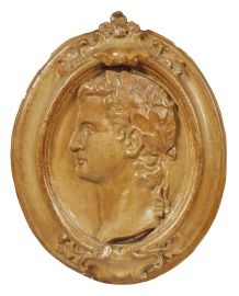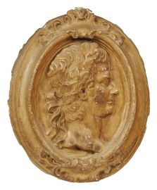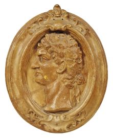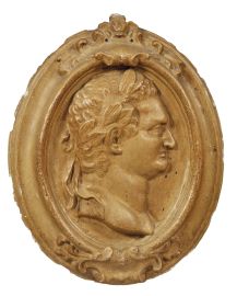 in gesso patinato di forma ovale raffiguranti profili di Imperatori con corone di alloro, entro cornici ovali con profilo sagomato ornate ai centri superiore e inferiore da cartigli da cui si dipartono girali di foglie, cm 55x43