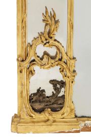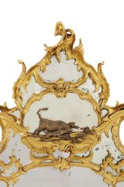 in legno intagliato e dorato, base modanata da cui si dipartono i montanti in foggia di doppia fascia ciascuna realizzata a profilo modanato attorno al quale si avvolgono fogliette, angoli superiori scolpiti a volute fogliacee e nastri pieghettati intrecciati che si portano in alto a creare l’ampia cimasa rocaille inquadrata da timpano spezzato e centrata da specchio ornato con motivo di caccia ad altorilievo in legno argentato, agli angoli inferiori due riserve sagomate profilate da volute e coronate in alto da cimasa rocaille inquadrano simili rilievi con scene di caccia; ai centri dei montanti, da piccolo fiore si dipartono due braccetti in ferro battuto in foggia di rami fogliacei ricurvi, cm 253x153