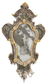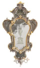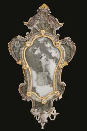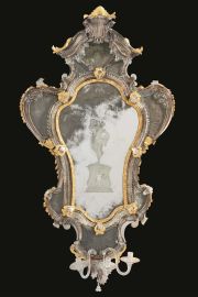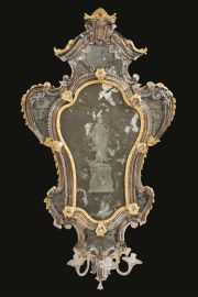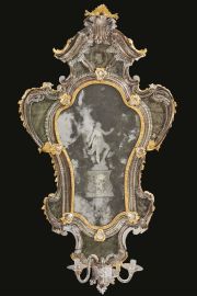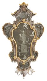 in vetro incolore inciso e legno intagliato e dorato, battuta sagomata intagliata a mezze foglie su fondo bulinato seguita da fascia modanata che da profilo rilevato scende su bordino a nastro ritorto ornata da applicazioni rilevate a fogliette stilizzate; fascia esterna ad ampie volute arricchite da foglie e profilata esternamente da bordo in legno dorato intagliato a motivi vegetali a inquadrare riserve geometriche incise a fiori con profilo maschile al centro superiore, che si portano in alto a creare la cimasa a foglia aperta arricciolata inquadrata da timpano spezzato sotteso da ventagli di foglie; dal centro inferiore, ornato da grande foglia che ricade verso il basso e terminante in pendente, si dipartono tre braccetti ricurvi con piattello circolare; specchi incisi a motivo di allegorie delle Virtù su ampio plinto decorato a panoplie, cm 155x88