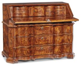 in noce e radica di noce, fronte a ribalta celante sportello centrale tra quattro cassettini di linea mossa disposti su due colonne, cui seguono tre cassetti mossi di linea spezzata, fianchi, tutta la superficie ornata da riserve filettate a inquadrare specchiature in radica, base modanata su piedi a mensola, cm 101x132x65