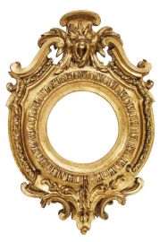 in legno intagliato e dorato, battuta circolare a gole lisce risale su profilo aggettante intagliato a unghiature che si porta con gola liscia su fascia mistilinea intagliata a nastro fogliaceo intrecciato con ampio motivo fogliaceo al centro inferiore e ricca cimasa scolpita a giorno con mascherone sostenuto ai lati da volute; ingombro cm 30x20,5, luce diam. cm 9,4