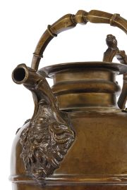 in bronzo patinato, piede circolare modanato con corpo a balaustro, ansa ricurva realizzata a forma di cariatide, beccuccio fitomorfo con attacco a mascherone, manico tornito che si diparte da teste di leone alla base, cm 64x44,5x34