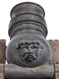 in bronzo, ruotabile in direzione longitudinale, inserito su supporto di legno dal profilo mistilineo con montatura in metallo; sulla canna è intagliato un mascherone, mentre sulla bocca da fuoco di forma modanata vi è l’iscrizione “MODENA”; cm 23,5x38,5x14