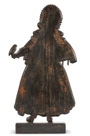 L’intrigante ed elegante bimbetta presentata rientra nella tipologia di oggetti denominati a partire dall’Ottocento “dummy board figures”, figure sagomate a grandezza naturale su sottili tavole di legno dipinte in maniera assai realistica e dettagliata, realizzate per divertimento e virtuoso inganno ottico e destinate per lo più agli interni di lussuose dimore, poste di fronte al camino o alle scale. Una diversa interpretazione le vedrebbe invece usate per combattere la solitudine e per questo denominate anche “silent companions”.